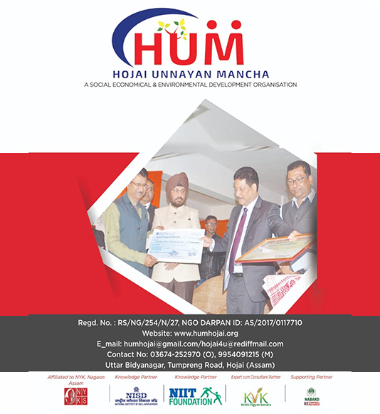 The Hojai Unnayan Mancha(HUM) Uttar Bidyanagar, Hojai, 782435. It is a Regd. Voluntary organization of Hojai under Nagaon District which is dully registered under the societies registration Act XXI of 1860 vide Reg. No RS/NG/254/N/27. It is dully governed by a strong Executive Committee. The organization has its rented building and it is enrich with needful infrastructures and adequate experienced official staff to conduct its development activities undertaken. The organization maintained a Bank Account at SBI, Hojai Branch which is jointly operated mainly by Director and President or Secretary as per norms of its constitution.